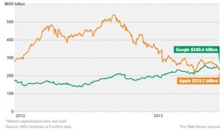 In questo momento se chiedete a google now la quotazione Apple vi viene restituita la risposta vocale di 399.74 dollari mentre Google viene scambiato a 874.29 dollari. Con queste cifre, in base a questo osservato dalWall Street Journal, l’enterprise value di Apple è di 223 miliardi di dollari, inferiore a quello di Google che ora è di 241 miliardi di dollari. Come viene calcolata questa cifra?